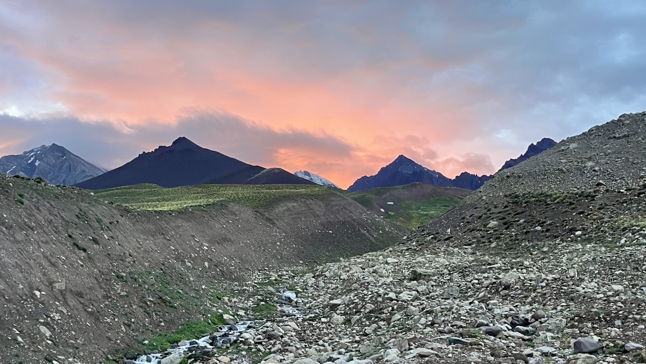 Con la llegada del cuarto día, el sendero se alargó y se hizo suave, guiándonos poco a poco hacia el valle glaciar, con el imponente Cerro Marmolejo vigilando nuestra marcha. Sus 6.100 metros, los más australes de un seis mil en el planeta, parecían custodiar nuestro Cruce de los Andes. A pesar de la llovizna, el atardecer nos regaló un cielo de fuego que jamás olvidaré.