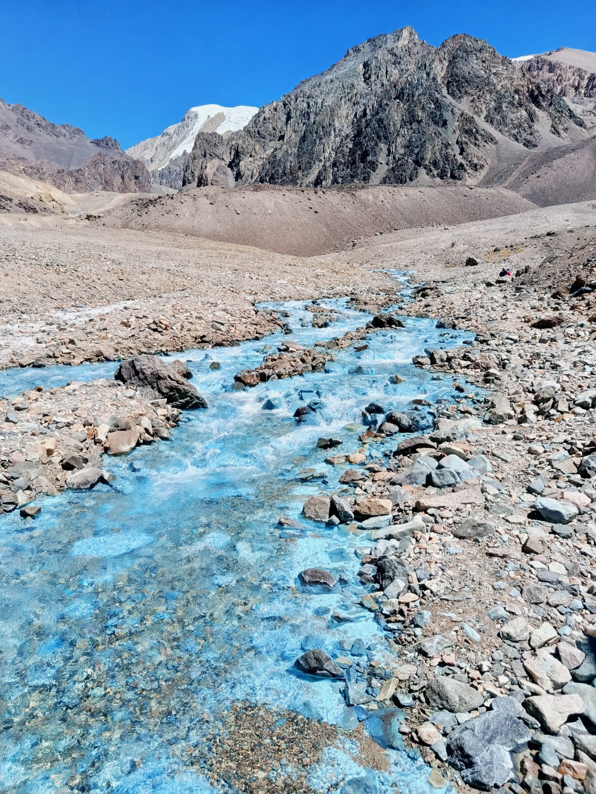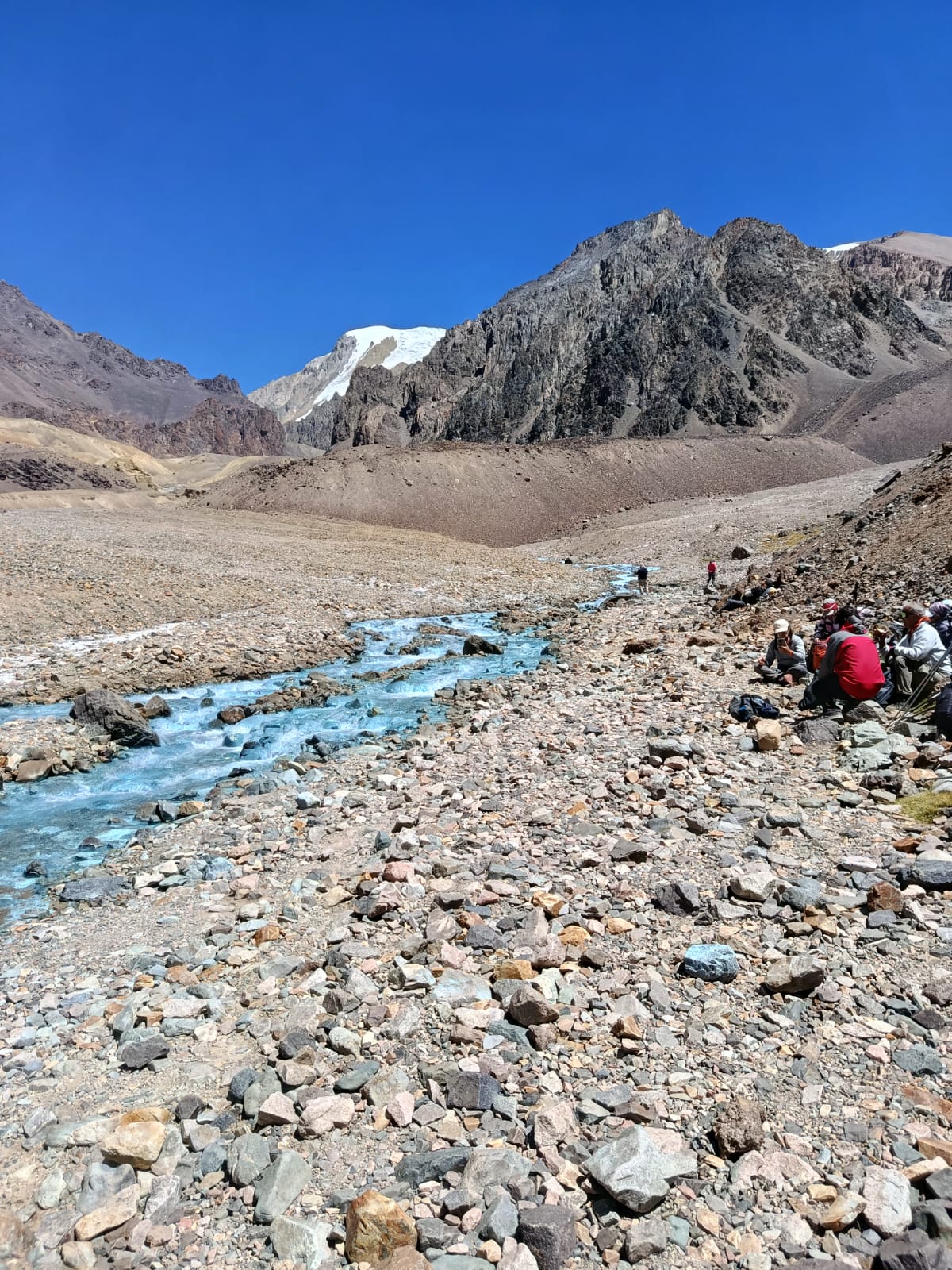 El esfuerzo de la subida se verá recompensado alrededor de las 13:00, cuando el color vibrante y mineral del agua se revele ante nuestros ojos. En este escenario irreal, disfrutaremos de un almuerzo de marcha rodeados de la inmensidad de la cordillera.
